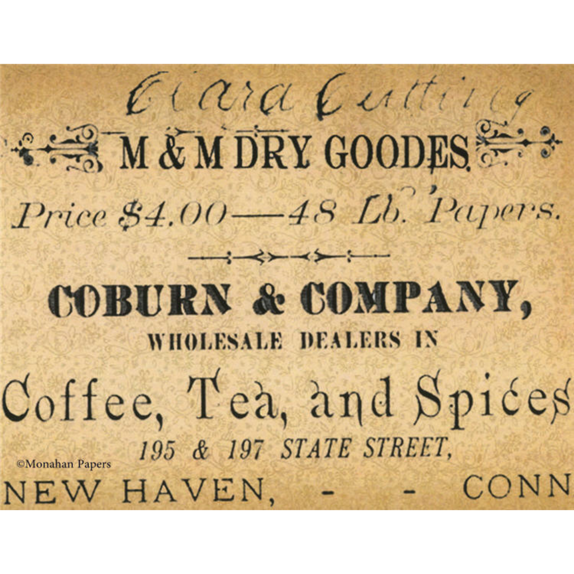 Based on a vintage sundries sign advertising coffee and tea in sepia and aged paper tones, this print is sure to make a statement in any space. With its rich texture and vintage appeal, Coburn & Company by Monahan Papers is the perfect way to add a touch of industrial chic to any room.