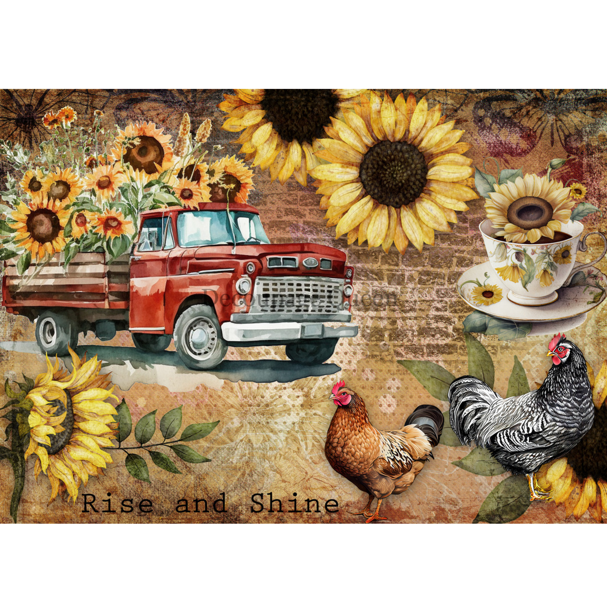 This beautiful paper features a flatbed red truck overflowing with bright, cheerful sunflowers, and a stunning background of teacups and roosters. With a peaceful and cozy style, this piece looks oh-so-inviting, making it perfect for adding a touch of cozy warmth to any decoupage project.