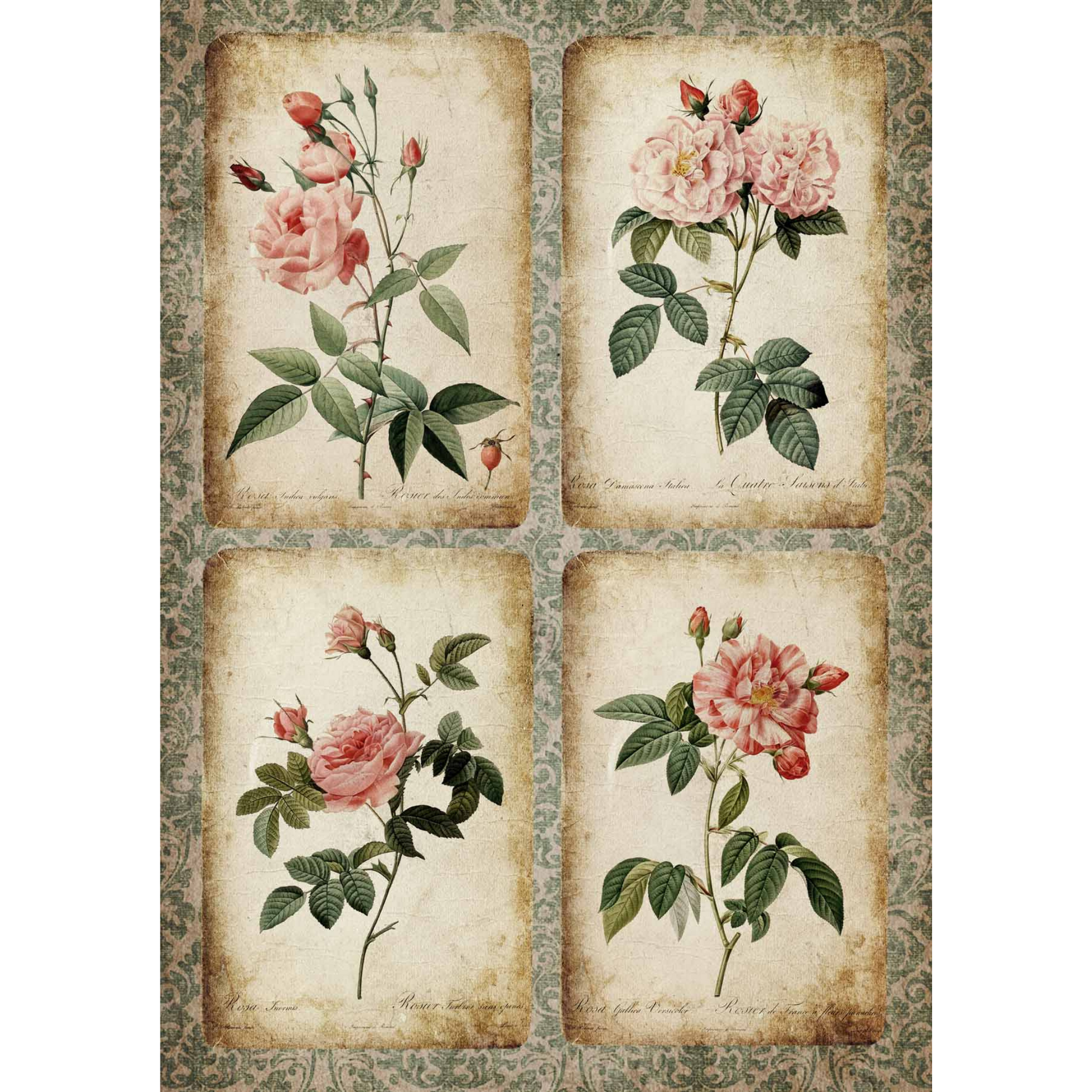 Four vintage images of pink rose botanicals on one sheet--perfect for your smaller decoupage projects.