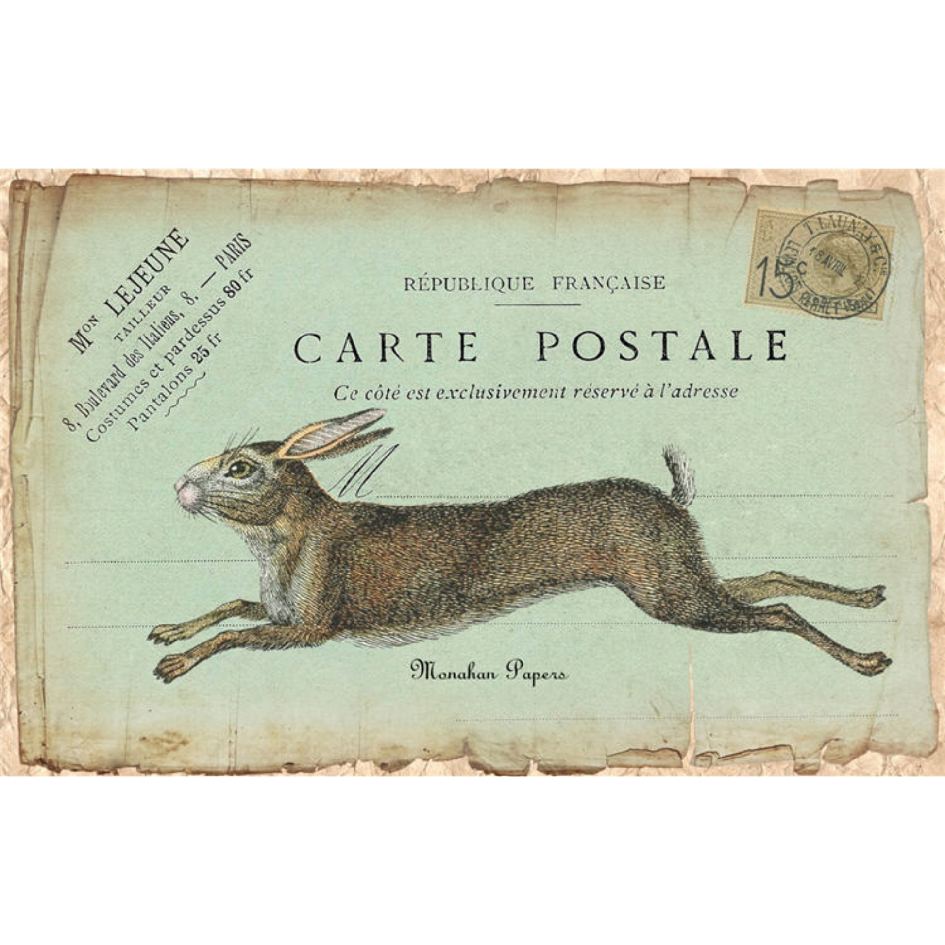 This Running Hare decoupage paper features a superimposed hare on top of postcard ephemera with a pale blue backgfround from a bygone era. Perfect for Easter projects everyday home decor, this high-quality paper is sure to make your decoupage projects stand out.
