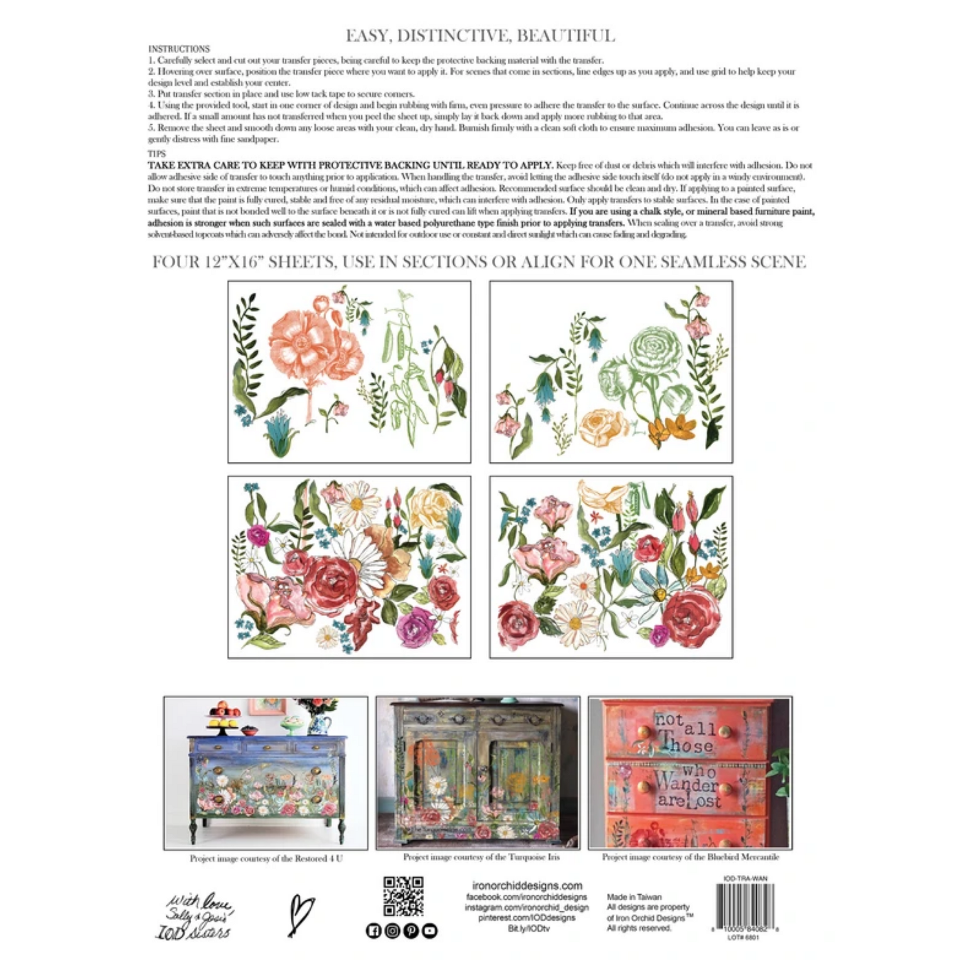 Use IOD furniture transfer decals to add visual style to your upcycled furniture and home décor projects. IOD furniture appliques are applied by rubbing them onto your project surface and can be cut, rearranged and overlapped to create new and unique designs.Â